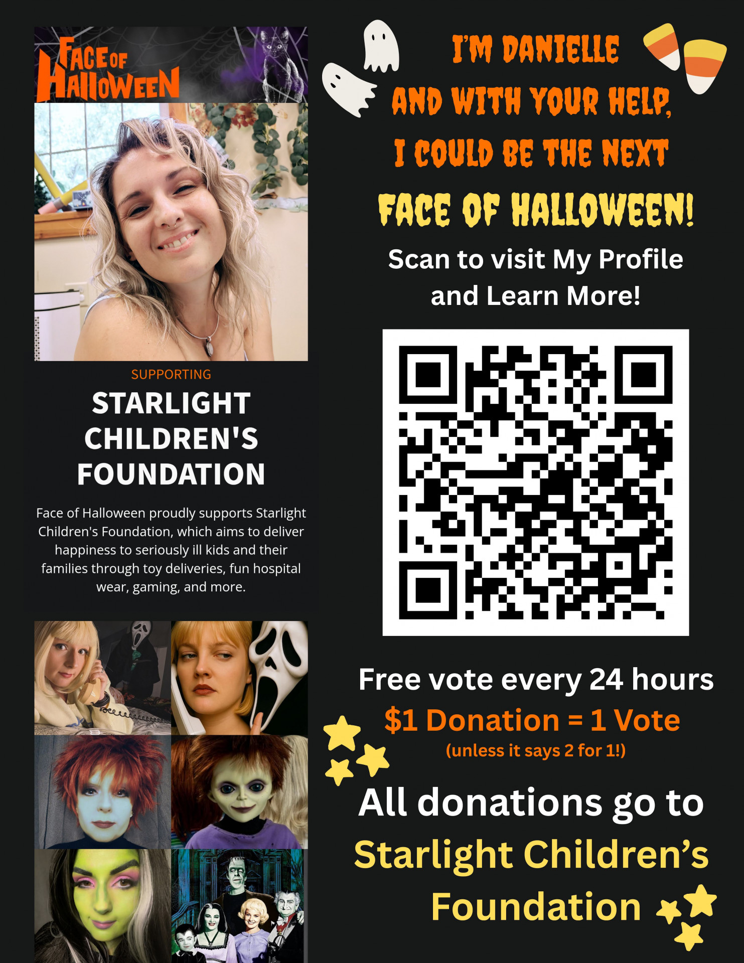 Help Danielle Bell become the next Face of Halloween while supporting a great cause! Cast your daily vote below, or make even more of an impact with a tax-deductible donation supporting the Starlight Children's Foundation.